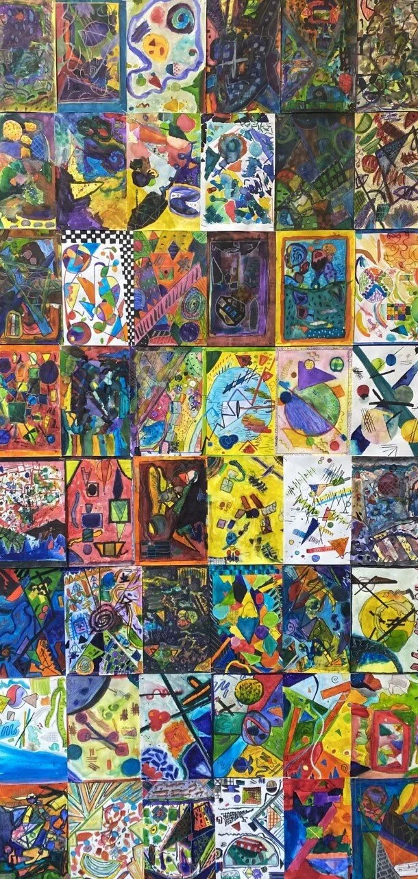 Watercolour paintings on A5 cartridge paper. The artworks were made in response to different music the pupils listened to and are based on the work and ideas of Wassily Kandinsky. Pupils are introduced to different ways of using colour, mark-making and working intuitively.